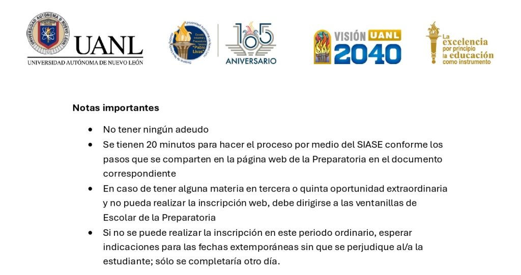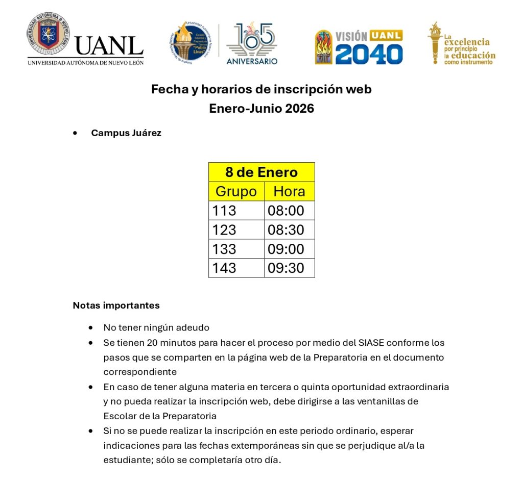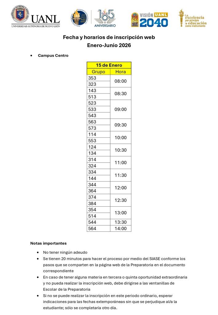 - Sólo se dispone de veinte minutos para realizar la inscripción. La fecha y hora de la inscripción pueden consultarse en la página web de la preparatoria.